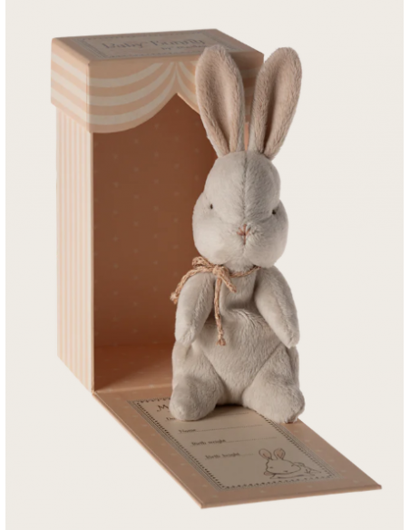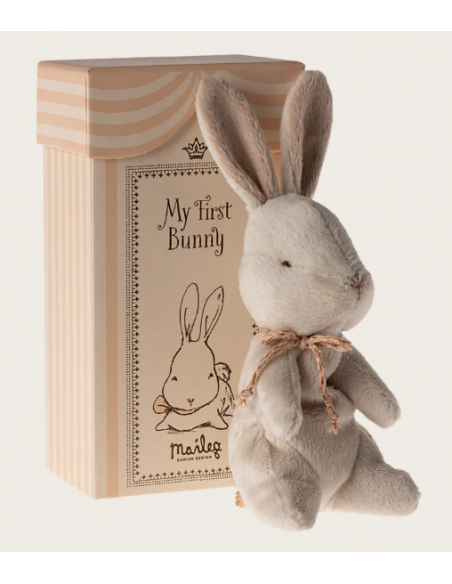 Mon premier Bunny est conçu pour les petites mains. Il est fabriqué dans une matière douce avec un ruban coloré autour du cou. Emballé dans une boîte cadeau où vous pouvez ajouter les informations de naissance