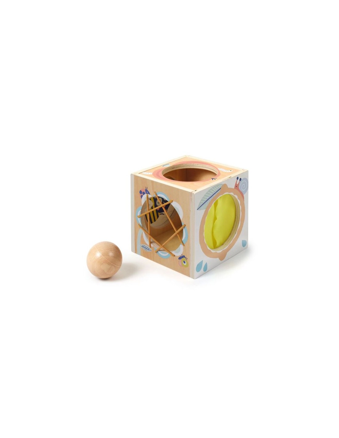 Votre enfant aura 4 façons différentes de cacher et retrouver ensuite la petite balle en bois : la glisser à travers des élastiques, ouvrir une petite porte, la faire passer par un grand trou et l'enfouir sous un tissu élastique. Le fond de la boîte est en feutrine pour atténuer le bruit lorsque la balle tombe.