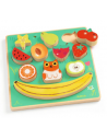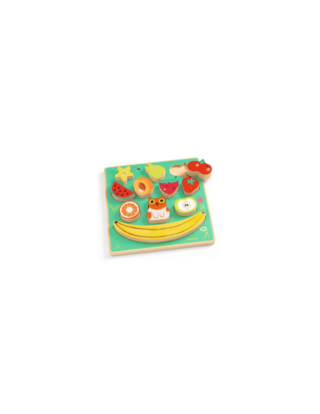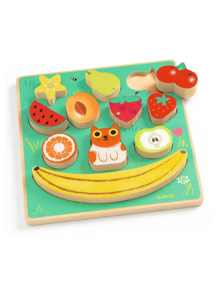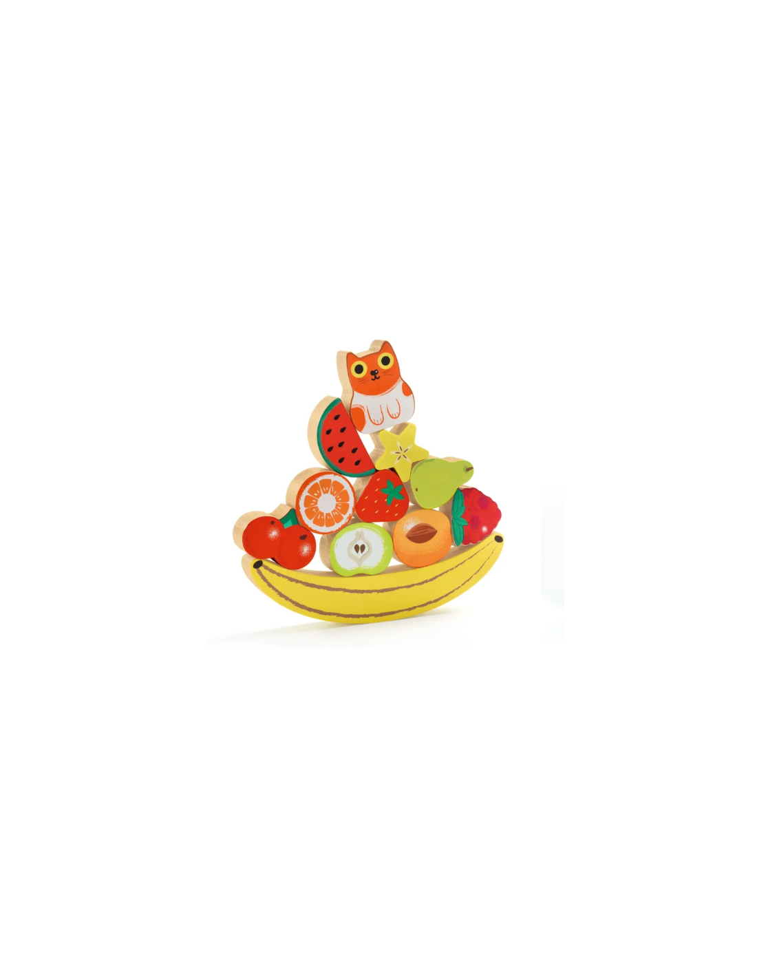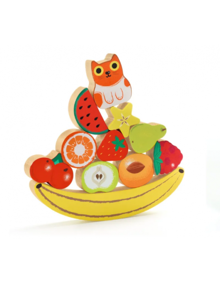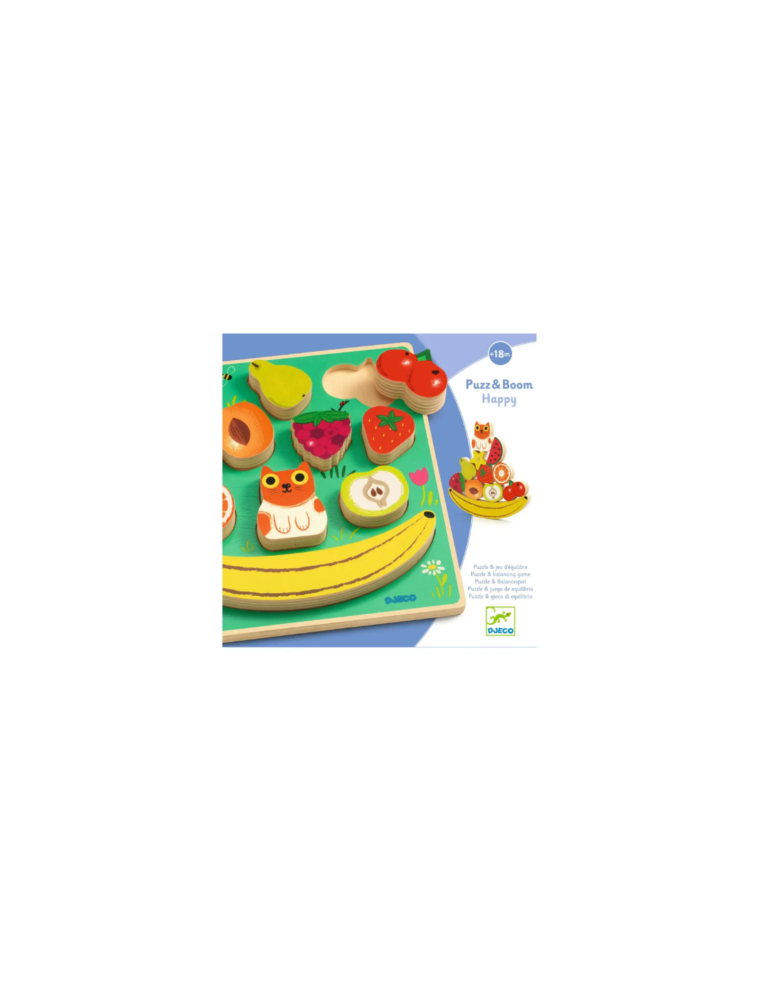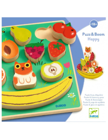 Puzz & Boom est un puzzle en bois facile à assembler et un jeu d'équilibre. Les fruits et le chat en relief tiennent debout et peuvent se poser en équilibre les uns sur les autres pour former une pyramide sur le socle « banane »