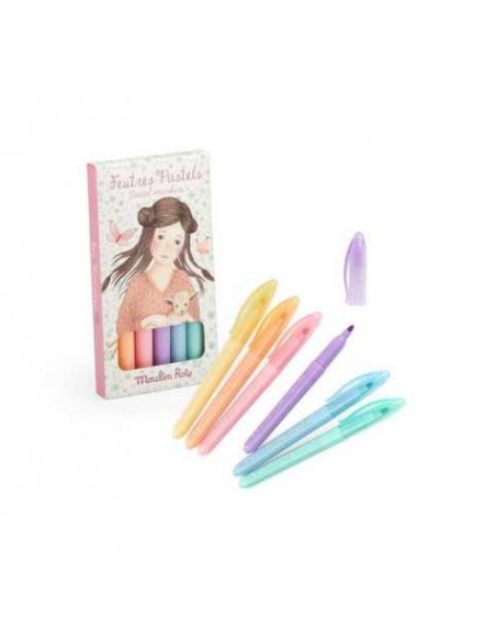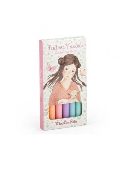 Découvrez les 6 feutres pastels de la collection Les Rosalies de Moulin Roty, 6 crayons aux couleurs douces pour donner vie à vos dessins, coloriages et toutes vos créations.