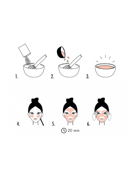 Masque detox au doux parfum rose-litchi, enrichi aux extraits de curcuma aux propriétés antioxydantes; et poudre de baie de goji riche en vitamines.